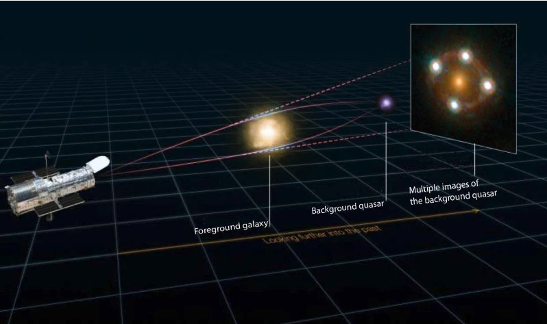 遙遠(yuǎn)類星體發(fā)出的光,在經(jīng)過前方星系的引力勢(shì)阱的時(shí)候發(fā)生了彎曲,所以光在到達(dá)望遠(yuǎn)鏡的時(shí)候所看到的圖片會(huì)像最右邊圖像所顯示的那樣。(圖源:Martin Millon/Swiss Federal Institute of Technology Lausanne;Hubble Space Telescope/NASA)